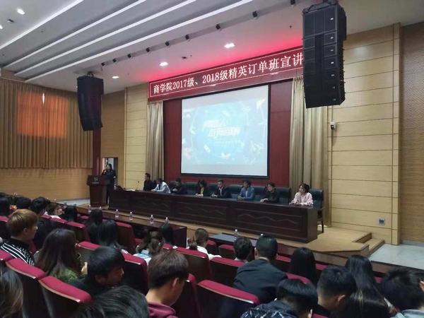 2018年11月2日下午2点,商学院在学术报告厅举行企业宣讲活动。经过认真遴选,商学院特邀吉利汽车集团、杭州赢动电商学院、青岛鹏腾国际船舶管理有限公司三家校企合作单位就“精英订单班”相关事宜来校进行宣讲。商学院院长董媛、相关教研室主任,以及2017级、2018级各专业学生三百余人参加了此次宣讲会。