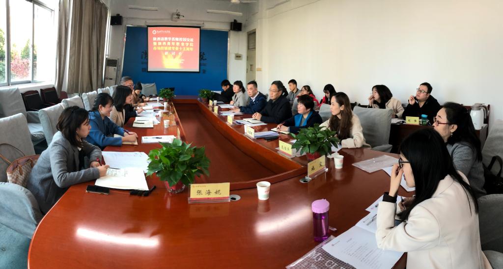 2019年11月14日上午,陕西省教学名师董媛一行赴陕西青年职业学院进行学术研讨活动。共青团陕西省委党组成员、陕西青年职业学院党委书记安强,陕西青年职业学院财经系主任孙莹娟,陕西青年职业学院市场营销专业带头人、市场营销教研室主任高佳燕,陕西青年职业学院财经系各专业骨干教师与学生代表;陕西工商职业技术学院骨干教师、陕西省教学名师刘晓花;陕西财经职业技术学院商学院院长董媛,陕西财经职业技术学院商学院副院长李福顺以及董媛名师工作室成员张馨予、席瑶、许潇参加了此次交流座谈。