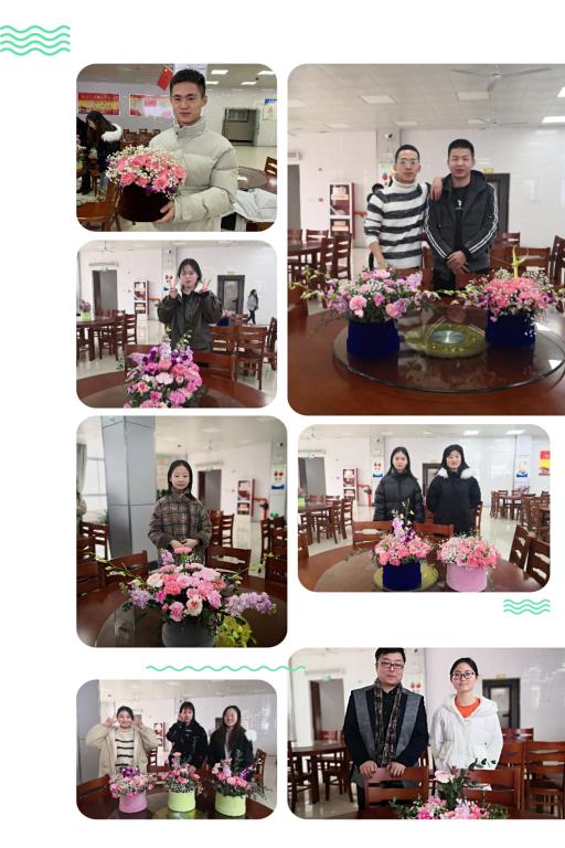 宁伟老师从花艺历史、花艺文化、中西插花的不同特点和插花技巧等方面,生动形象地给同学们普及了理论知识,讲解了插花类型、基础造型、花材的基本使用、插花中尺寸的确定与裁剪方法、设计搭配技巧等知识,现场互动融洽,掌声阵阵,气氛热烈。课程结束后,学生作品在教工餐厅展出,得到全校老师的一致好评。