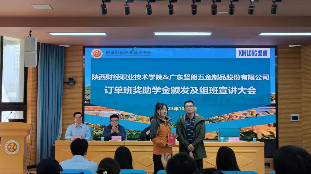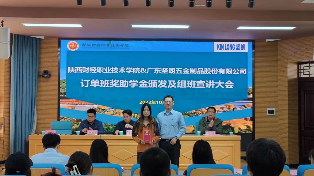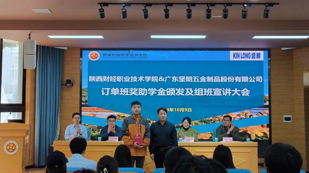 会议开始,广东坚朗五金制品股份有限公司咸阳办事处副总杜砚泽率先发言,并分享了坚朗公司近几年与我校合作的优异成果,期冀同学们踊跃加入坚朗订单班。随后,我院党总支书记张晓战为同学们送上开班寄语,鼓励同学们砥砺奋进,追光逐梦,学有所获。副院长张馨予现场宣读2022级坚朗订单班奖助金学获奖名单,并邀请领导和嘉宾为获奖学生颁发奖牌证书。2022级坚朗订单班奖助学金代表粟瑞和研学营优秀代表夏少春分别进行了分享,在表达对学校和坚朗公司感谢的同时,也号召2023级新同学们积极把握机会。