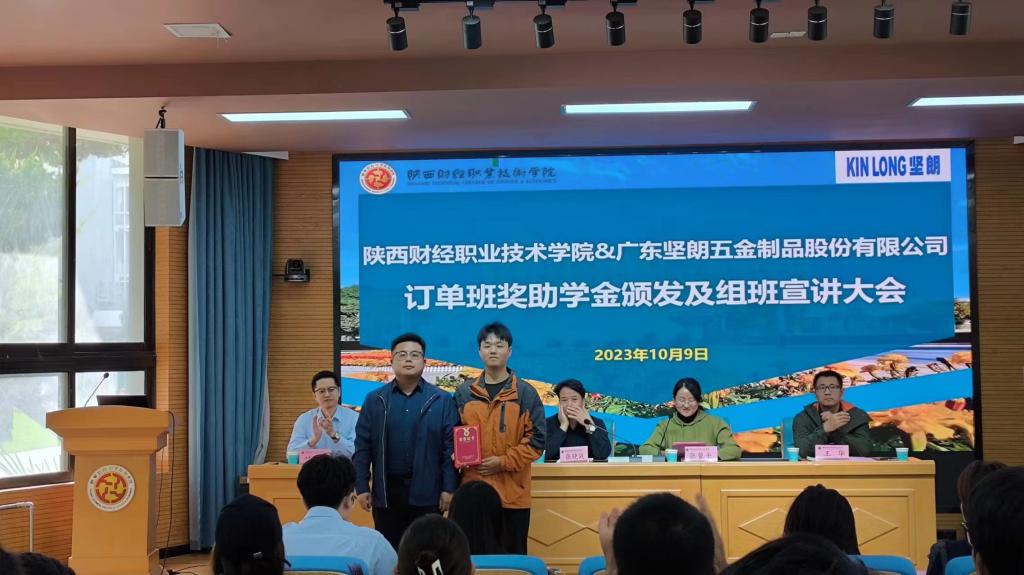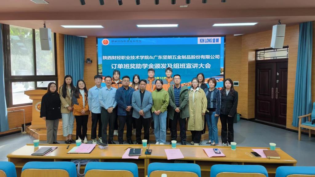 2023年10月9日,数字商务学院市场营销专业坚朗订单班2022级奖助金学颁发暨2023级组班宣讲会议在我校继续教育报告厅成功举行。与会领导和嘉宾有坚朗订单班校企合作单位广东坚朗五金制品股份有限公司的咸阳办事处副总杜砚泽、人资主管叶君强、校企专员刘志豪、人资助理兰馨,数字商务学院党总支书记张晓战、副院长张馨予、专职副书记王华、学生科科长杨阳、教学科科长许潇、团总支副书记张欣瑞、商贸流通系主任刘昙以及市场营销专业全体教师。