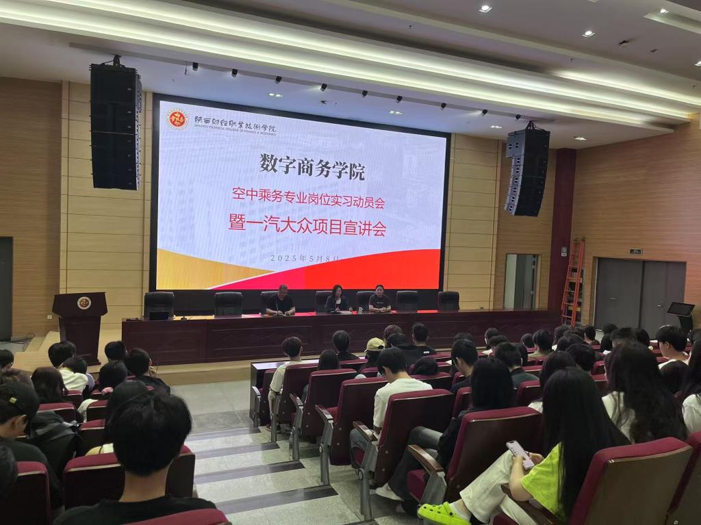 2025年5月8日,我院为即将踏上实习征程的空中乘务专业学生举办了一场内容充实、意义深远的实习动员会,旨在帮助学生明确实习目标、熟悉实习要求、调整心理状态,为即将到来的实习生活做好充分准备。动员会在学术报告厅隆重举行,数字商务学院院长董媛、党总支书记张晓战、专职副书记杨阳、旅游服务系主任丁小伟、空中乘务专业教师及23级空中乘务专业全体学生齐聚一堂。
