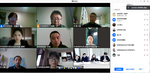 2021年1月29日下午16时,陕西财经职业技术学院与彬县职业教育中心召开了中职学校电子商务专业实训基地建设方案线上研讨会。我院商学院院长董媛、副院长李福顺、商贸流通系系主任张馨予及商学院电子商务专业各骨干教师、彬县职业教育中心教务处主任任栋平、信息系负责人徐辉老师、电商教研组长焦琪老师、专职教师李敏老师参加了此次研讨会,会议由张馨予主持。