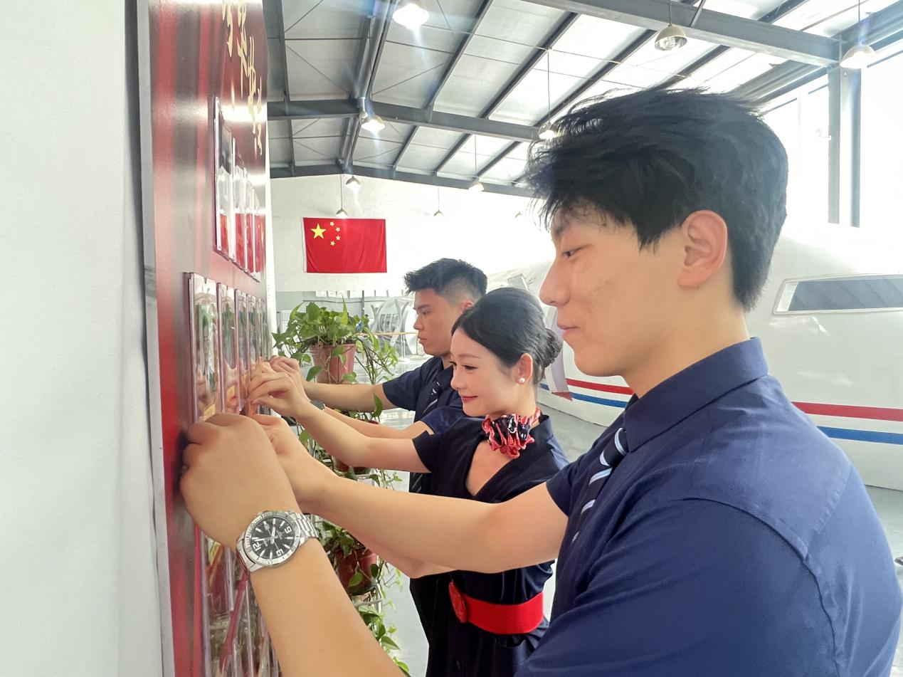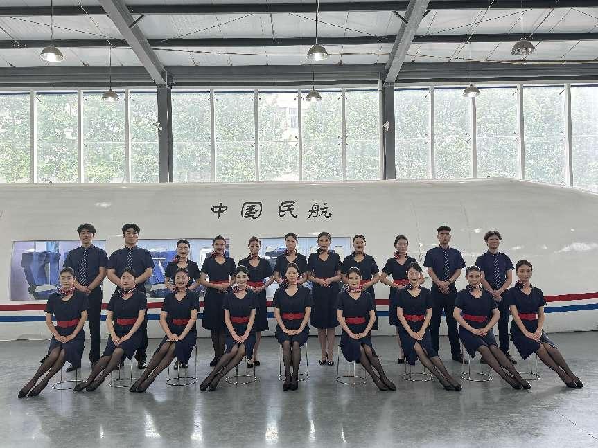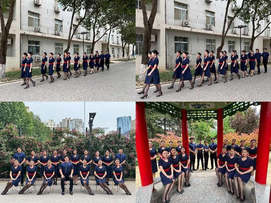 在模拟舱实训室,同学们将已毕业进入到航空公司、在各行各业的优秀毕业生照片挂上了荣誉墙,激励同学们向学姐学长看齐,努力在未来也能在各个领域发光发亮,为社会作出自己的一份贡献。在形体训练室,同学说通过对底妆、定妆、眉毛、眼影、眼线、睫毛膏、修容、腮红、口红九大步骤的进行形象打造展示,体现空中乘务职业的统一性、纪律性,展现了航空公司的整体形象,体现出对职业的尊重,对乘客的尊重。在礼仪展示环节中,空中乘务专业的学生在校园列队行进,队列组织及管理有助于提升学生职业化的姿态和形象,树立严格的组织纪律性和较强的时间观念,在日常点滴中潜移默化培养专业职业素养,同学们分别展示了男女乘务员优雅稳重、节奏明快的行姿,标准站姿及插手站姿,以及乘务员身着制服时的发行标准及妆容标准,同时展示了着制服时领带、裤子、袜子、鞋子的要求。