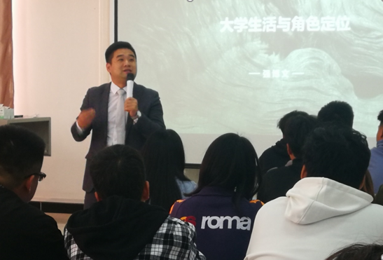 紧接着,境商集团培训经理强博文为同学们做了题为大学生活和角色定位的主题讲座。他从自己的大学生活出发,结合自身实际告诉在坐的各位新生,大学生活应该有更多的尝试,比如:大学里应该有几个生死相交的兄弟姐妹、应该建立独立的思维模式,应该有面对生活挫折的勇气,也可以谈一场轰轰烈烈的爱情,总之每位学生要让自己成为有大局意识、有人格魅力,有人性、有人格、有人品的“2有3人”。在讲座的最后他说“时代变了,在这最好的、也是最坏的年代里,我们每位大学生要学会读人心、读人脉、读人性、更重要的是读自己,要不断的拓宽自己的生活的宽度、深度、热度、速度这四度,做强做大自己,合理安排自己的大学生生活,你想要的时间都会给你”。