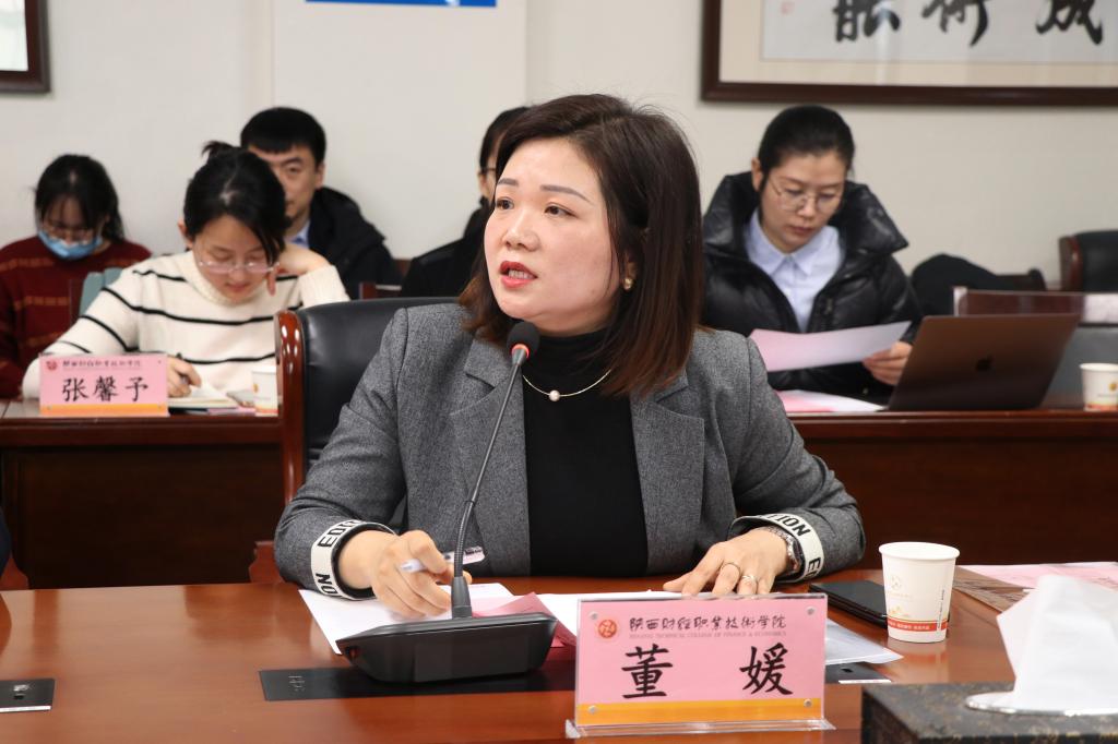 其次,陕商文化研究中心负责人董媛教授从团队建设、科研建设、专业建设、资源库建设、社会服务等几个方面详细介绍机构发展情况,研究中心成员探索建立了“职业技能与商业精神相结合、学校学习与社会实践”的全方位课程思政育人模式。将中国商人的“勤毅诚朴”与培养学生的职业技能有机结合,培养学生以爱国主义为核心的民族精神、以改革创新为核心的时代精神和以自强不息为核心的宝贵品格,成为新时代社会主义建设者和接班人。同时积极对接数字经济和服务经济发展对人才的需求,让商贸更好地发挥对富强国家、造福人民、传播文化和发展社会的推动力量,为我国经济建设发展培养更好质量的新商科技术技能人才。